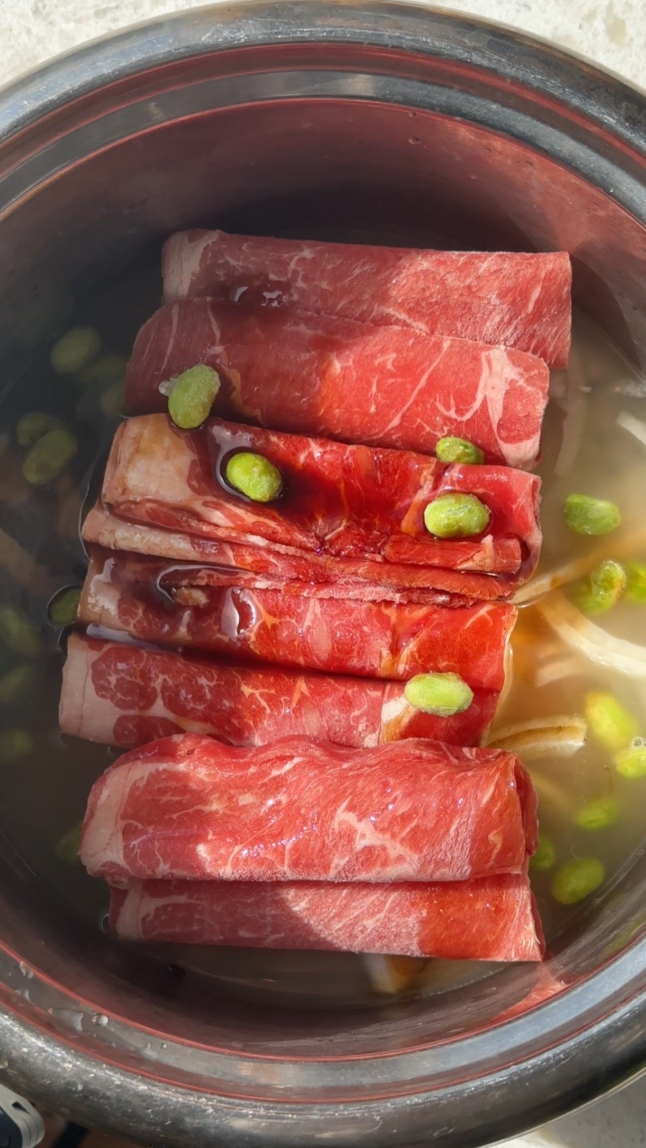 Add sliced onions, beef, edamame, soy sauce, mirin. Turn on rice cooker