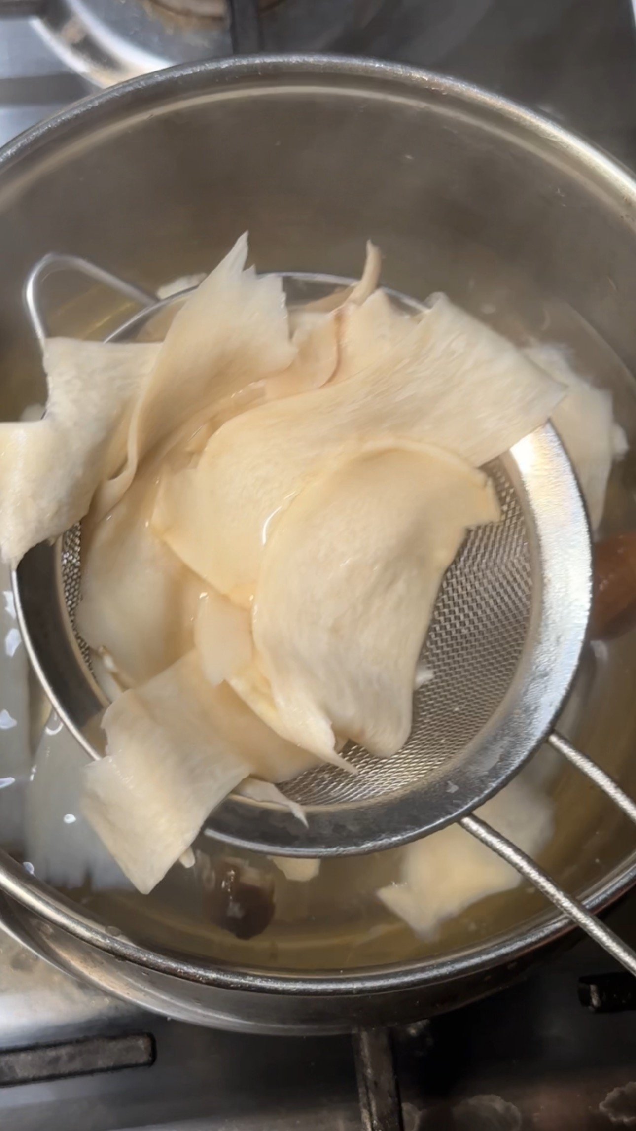 In this recipe, the mushrooms are first sliced thin using either a knife or a peeler. This step creates wide, flexible pieces that wrap easily around the skewers. Then, they are briefly boiled. This softens the mushrooms and removes excess moisture, helping them cook evenly later.