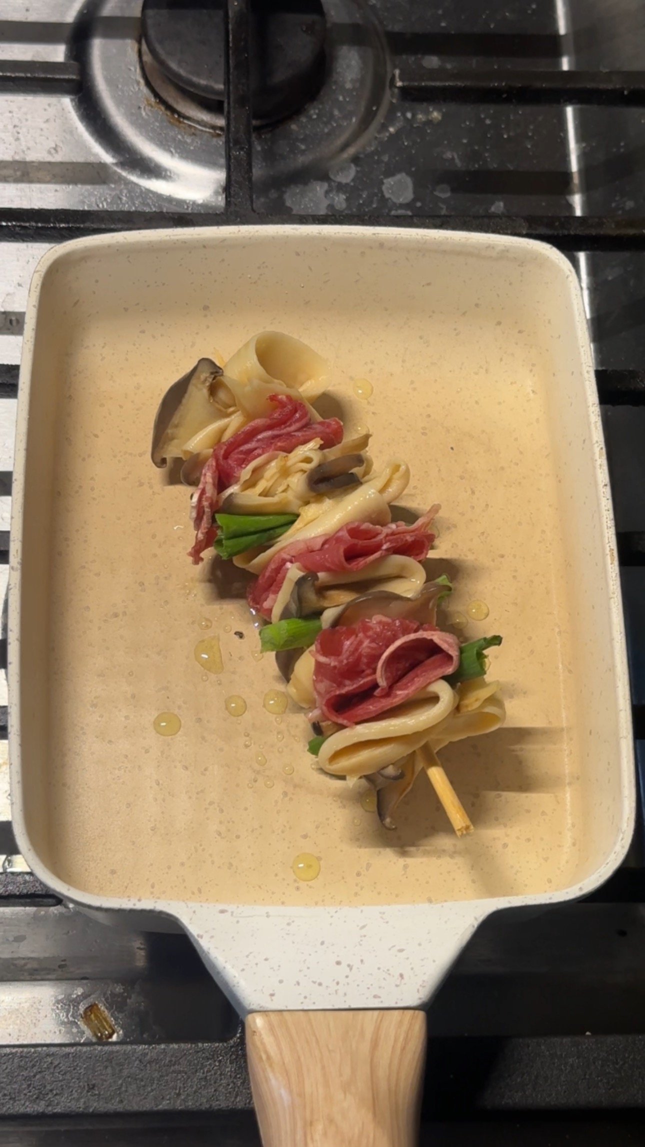 After draining, the mushrooms are layered with beef and green onion on skewers. The combination is simple but balanced. The beef adds richness, while the green onion brings freshness and a mild bite.