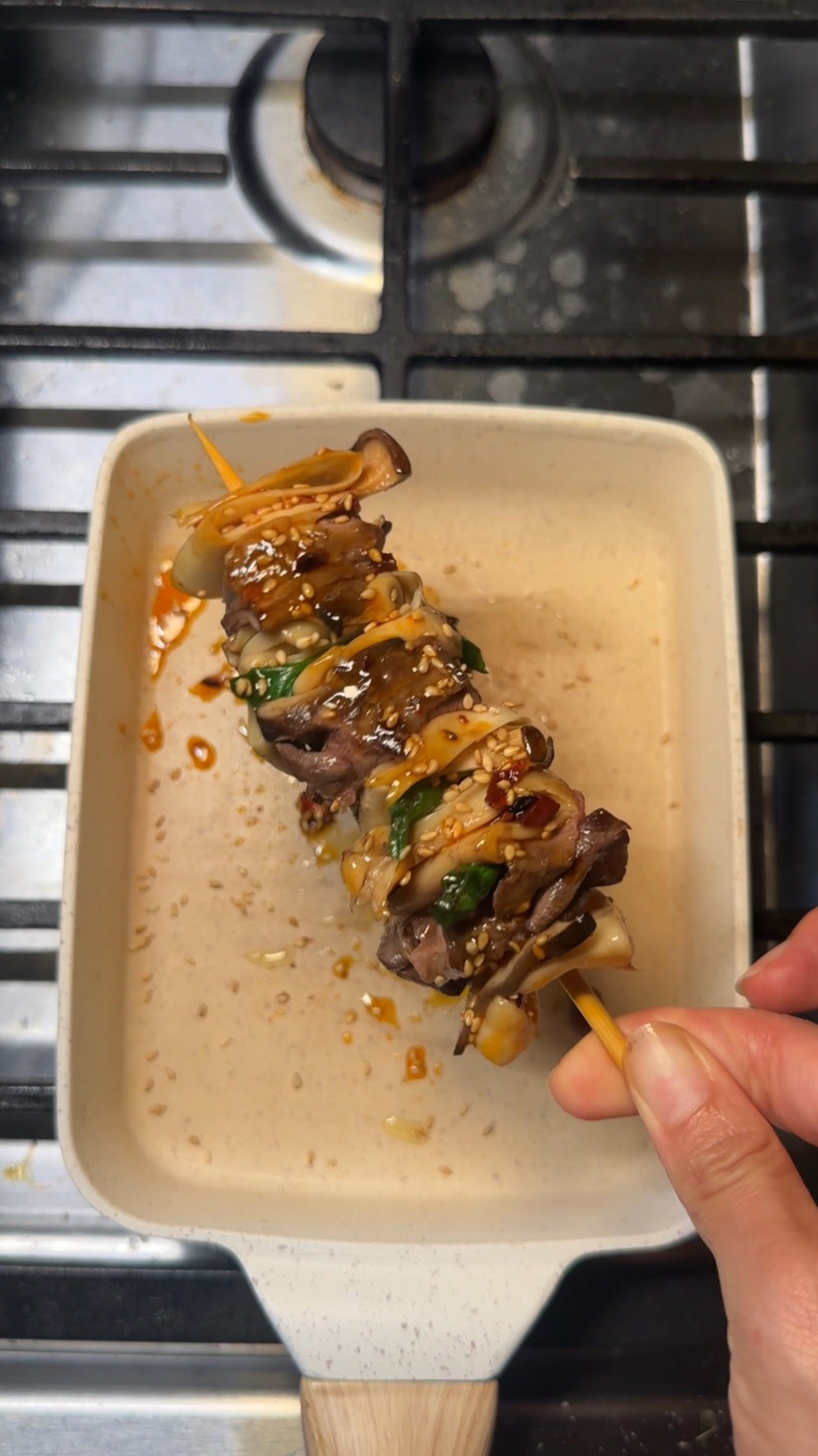 Next comes a quick pan fry. The skewers cook for about one minute on each side. This is just enough time to brown the beef while keeping everything juicy. Because the ingredients are thin, they cook very quickly.