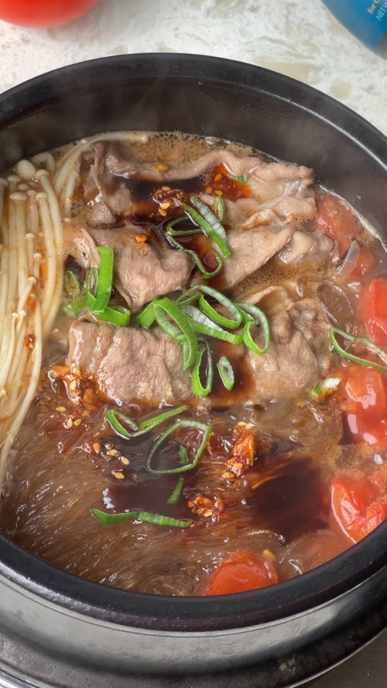 Chinese Beef Tomato Vermicelli Noodle Soup is a comforting, flavorful dish perfect for any time of day. It combines tender ribeye, sweet and tangy tomatoes, and delicate vermicelli noodles in a rich, savory broth. This soup is not only satisfying but also quick enough for a weeknight dinner, yet impressive enough to serve to guests. The combination of fresh vegetables, tender beef, and aromatic herbs creates a well-balanced meal that hits all the right notes. Plus, the addition of enoki mushrooms brings a light, earthy flavor that complements the richness of the bone broth and oyster sauce. Each spoonful is a perfect harmony of textures and flavors—soft noodles, succulent beef, and juicy tomatoes simmered in a deeply savory broth.
