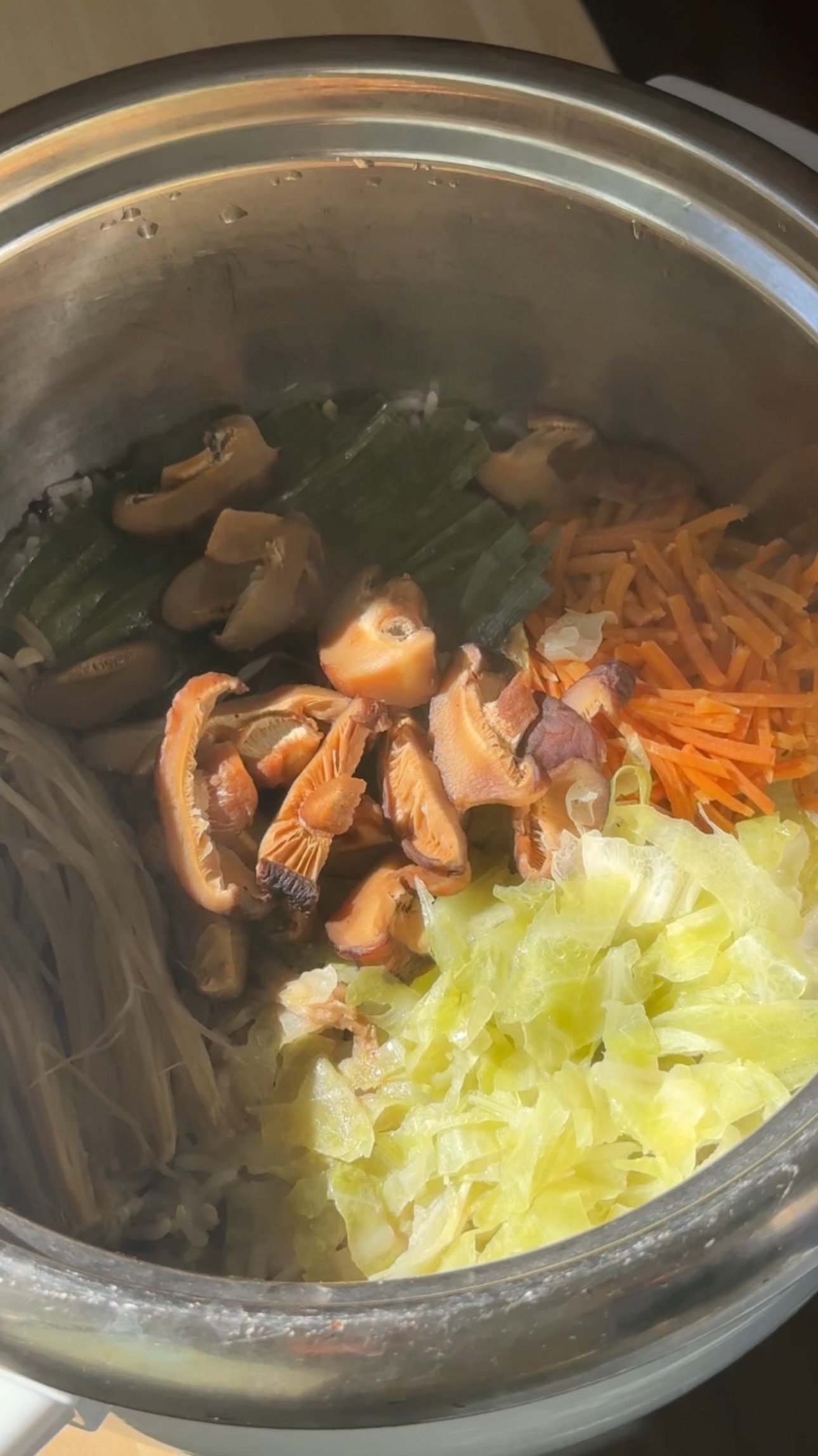 2. Place the beef slices evenly on top of the rice. Add the sliced onion, cabbage, chives, carrot, and both mushrooms on top of the beef.